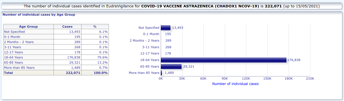 Laut der Datenbank wurden für das Gen-Therapeutikum AstraZeneca mit Stand 15. Mai 2021 222.071 Fälle eingemeldet. Dies entspricht einer Zunahme um 37.238 Fälle, respektive von 20,1% in etwas mehr als drei Wochen: