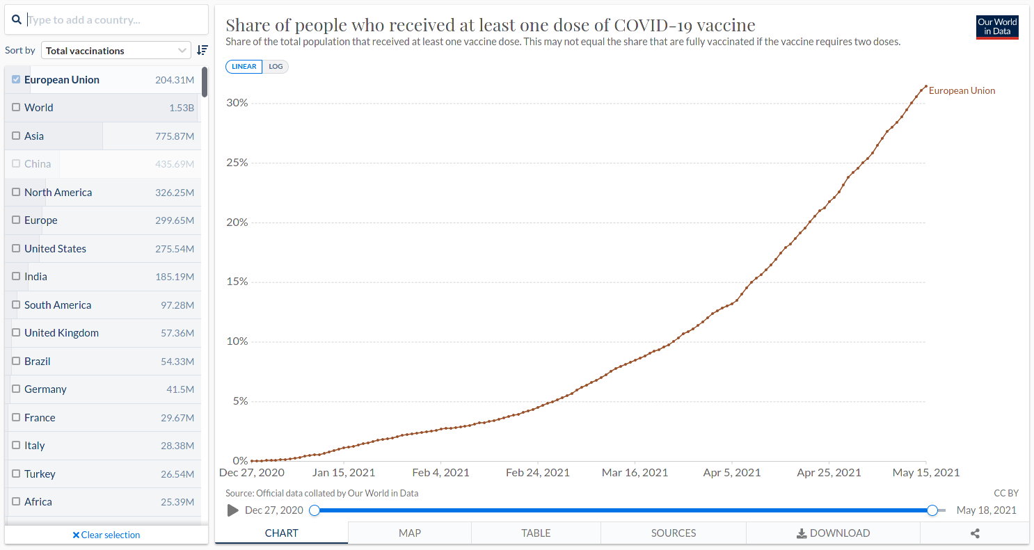 Laut der Website Our World In Data wurden per 15. Mai 2021 31,45% der Menschen innerhalb der EU mindestens einmal „geimpft“. Dies entspricht 204,31 Millionen, einer Steigerung um ca. 69,1 Millionen: