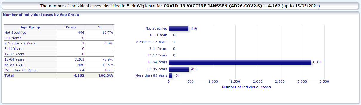Laut der Datenbank wurden für das Gen-Therapeutikum Janssen mit Stand 15. Mai 2021 4.162 Fälle eingemeldet. Dies entspricht einer Zunahme um 3.749 Fälle, respektive von 907,7% in etwas mehr als drei Wochen: