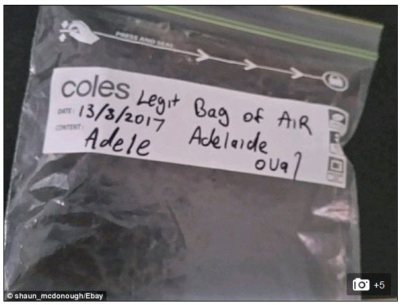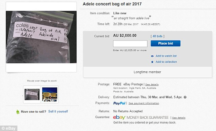 Richtig gelesen. Die inzwischen entfernte Anzeige über einen „Frischhaltebeutel voller Luft“, die vom Verkäufer auf einem Adele-Konzert „eingesammelt“ wurde stand knapp drei Tage vor Ende der Auktion bei 2.000 Australischen Dollar (umgerechnet ca. 1.400 Euro). Großzügigerweise hatte der Verkäufer sein Angebot mit „Freiem Versand“ markiert – vielleicht der Grund, warum so viele mitgeboten haben?