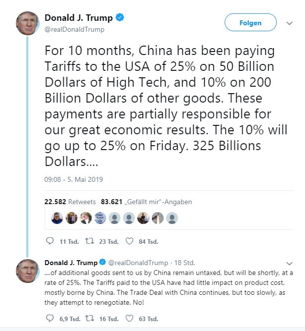 Zumindest erscheint es aktuell so zu sein. Die plötzliche Verschiebung der Rhetorik wird die Märkte sicherlich „belasten“. Denn erst letzte Woche wies Trump darauf hin, dass eine Einigung noch im Mai kommt. Jetzt ist der US-Präsident plötzlich willens, den Handelskrieg durch enorme zusätzliche Strafzölle und eine Beschleunigungen zu verschärfen, indem er die Zölle auf chinesische Waren auf 25% erhöht. Und das bereits zum KOMMENDEN FREITAG.