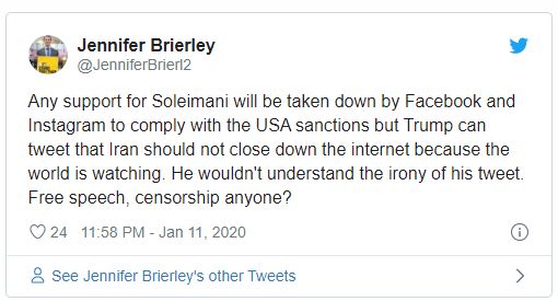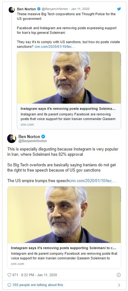 („These massive Big Tech corporations are Thought Police for the US government: Facebook and Instagram are removing posts expressing support for Iran’s top general Soleimani,“ journalist Ben Norton tweeted. „They say it’s to comply with US sanctions, but how do posts violate sanctions?“)