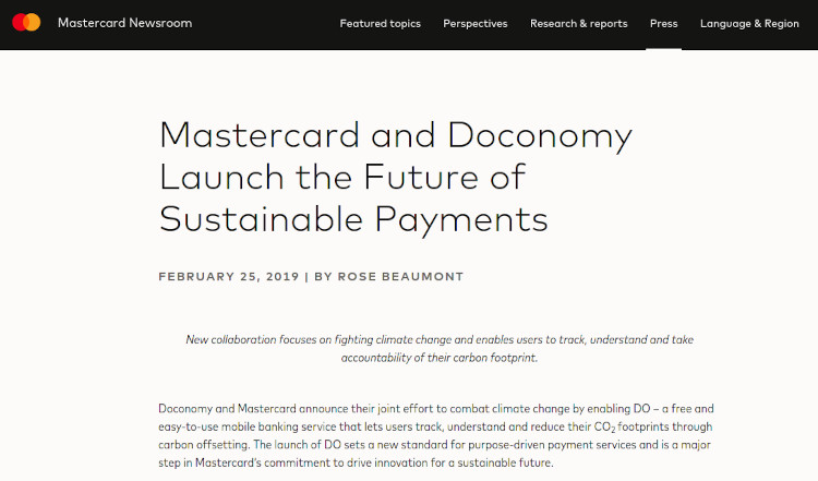 (joint effort to combat climate change by enabling DO – a free and easy-to-use mobile banking service that lets users track, understand and reduce their CO2 footprints through carbon offsetting. The launch of DO sets a new standard for purpose-driven payment services and is a major step in Mastercard’s commitment to drive innovation for a sustainable future.)