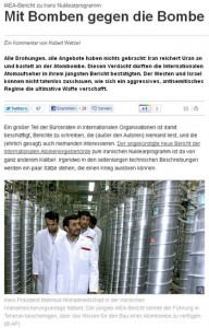 Alle Drohungen, alle Angebote haben nichts gebracht: Iran reichert Uran an und bastelt an der Atombombe. Diesen Verdacht dürften die Internationalen Atomaufseher in ihrem jüngsten Bericht bestätigten. Der Westen und Israel können nicht tatenlos zuschauen, wie sich ein aggressives, antisemitisches Regime die ultimative Waffe verschafft.