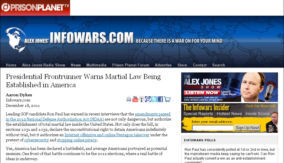 Leading GOP candidate Ron Paul has warned in recent interviews that the amendments passed in the 2012 National Defense Authorization Act (NDAA) are not only dangerous, but authorize the establishment of total martial law inside the United States. Not only does the bill, in sections 1031 and 1032, declare the unconstitutional right to detain Americans indefinitely without trial, but it authorizes an Internet offensive and online Pentagon takeover under the pretext of cybersecurity and stopping online piracy.