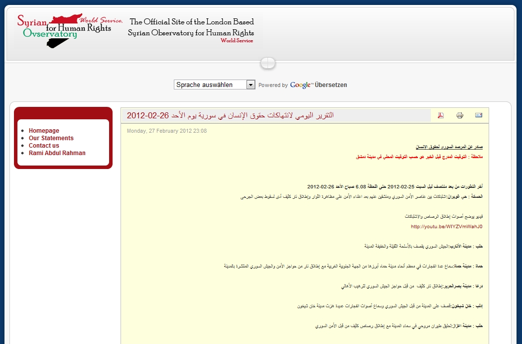 Jedoch sind nur wenige solcher Berichte, jedoch keinerlei Bilder oder Videos auf der Site zu finden. Gleichzeitig wird aber diese „Beobachtungsstelle“ als alleinige, legitime und glaubwürdige Quelle in allen – voneinander abschreibenden Reuters, AP, AFP – Mainstreammedien genannt. Zusätzlich sind die meisten der eingestellten Artikel in arabischer Sprache verfasst und nicht auf Englisch was wiederum nicht gerade auf eine hohe Professionalität dieser „Beobachtungsstelle“ hindeutet.
