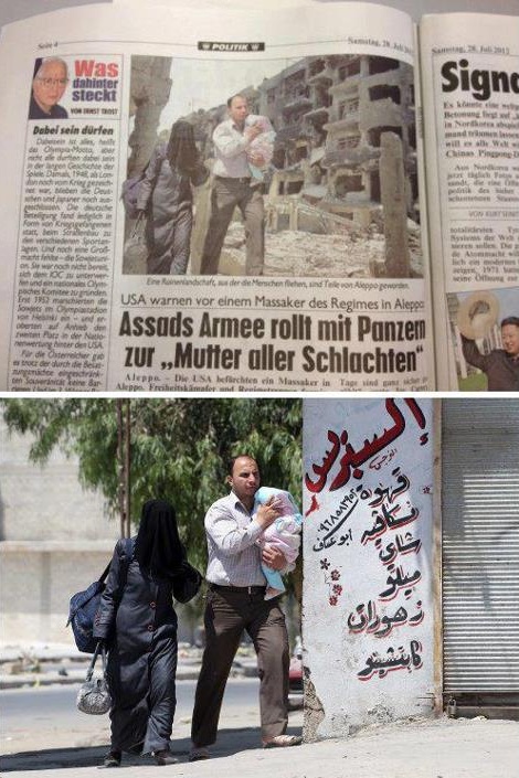 Am vergangenem Samstag erschien in der „Kronen Zeitung“ ein kriegshetzerischer Bericht zu Syrien, der mit einem Bild flüchtender Einwohner von Aleppo unterlegt war. Jedoch wurde sehr schnell entdeckt, dass es sich bei dem Bild um eine Fotomontage handelte, bei der die Einwohner aus einer beliebigen arabischen Stadt in das Bild einer zerstörten Häuserzeile (selbst hier stellt sich die Frag, ob es sich um Aleppo handelt?) hinein retuschiert wurden: