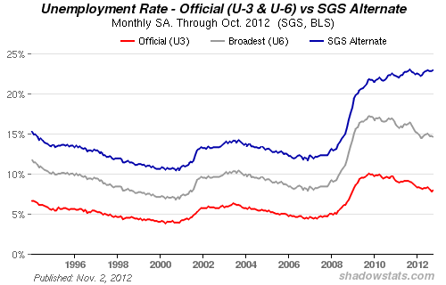 Das Ganze bei einer offiziellen Arbeitslosenquote von 7,9% und 143,4 Millionen Beschäftigten. Da bekanntlicherweise bei den Zahlen rund um das Thema Arbeitslose seitens des Staates (egal, ob in den USA, Deutschland oder sonstwo) mit allen Tricks und Unwahrheiten gearbeitet wird, ist ein Blick auf die inoffizielle Statistik von www.shadowstats.com interessant. Shadowstats berechnet seine Arbeitslosenzahlen immer noch nach der bis in die 90er Jahre gültige Berechnungsmethode U-6, die bis einschließlich 1994 in den USA verwendet wurde. Und hier sieht man – überraschenderweise – ganz andere Zahlen: