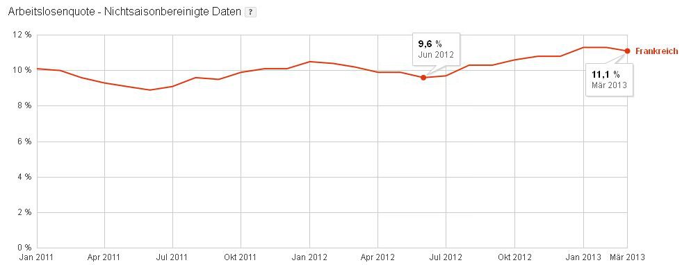 Betrachtet man ein par Zahlen zu Frankreich fällt einem der starke Zuwachs der Arbeitslosenzahlen seit der Amtsübernahme durch Francois Hollande auf: