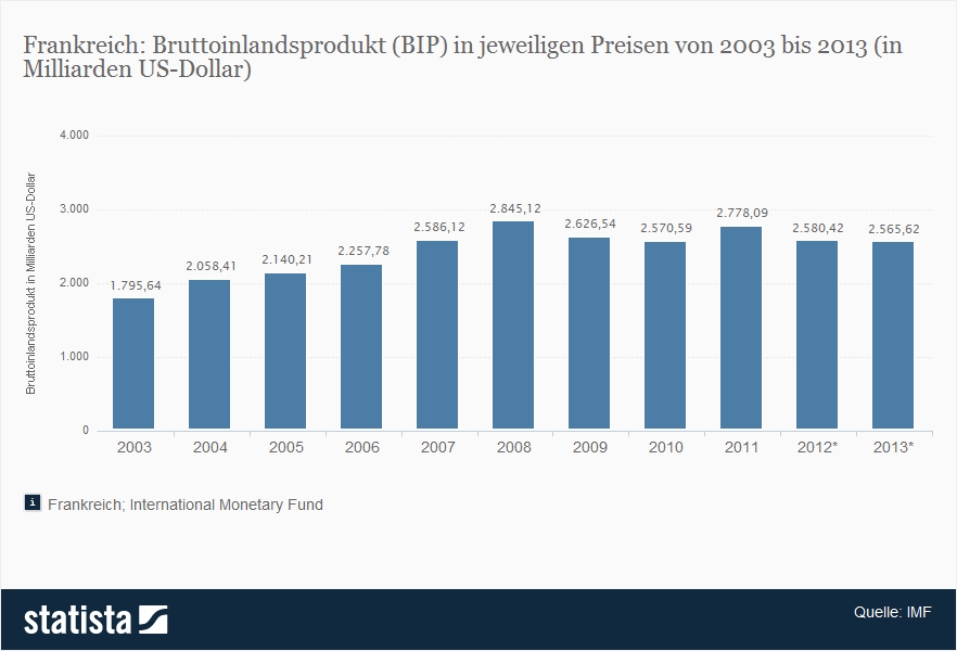 Frankreich: Bruttoinlandsprodukt (BIP) in jeweiligen Preisen von 2003 bis 2013 (in Milliarden US-Dollar)