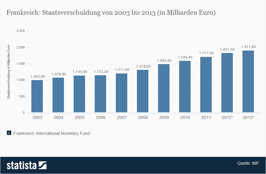 Ähnlich sieht es bei den Staatsschulden Frankreichs aus. Auch hier wird ein Zuwachs um 4,4% im Vergleich zu 2012 erwartet: