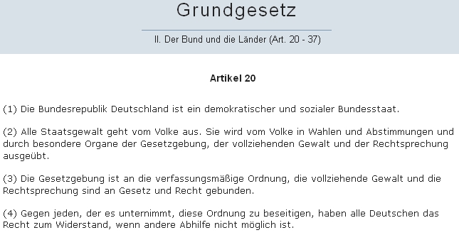 Besorgniserregend ist zusätzlich die rein zufällig gleichzeitig stattfindende Verhandlung zum ESM bzw. dem sog. OTM-Programm vor dem Bundesverfassungsgericht in Karlsruhe. Mit Herta Däumler-Gmehlin tritt dort eine prominente Klägerin auf, die zusammen mit dem Verein Mehr Demokratie e.V. eben genau jene Volksentscheide in Form einer Grundgesetzänderung einfordert. Dass eine Stärkung der direkten Demokratie nach dem Vorbild der Schweiz zu begrüssen ist, steht außer Frage, jedoch gibt uns unser Grundgesetz diese Möglichkeit bereits durch den Artikel 20: