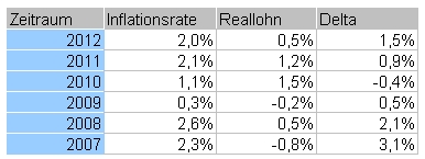 Ausgehend von der obigen Defintion kann man also sagen, dass die Reallohnzuwächse bzw. -rückgänge auf eine steigende oder sinkende Lebensqualität schließen lassen. Wenn man sich die Reallohnindices seit 2007 des Statistischen Bundesamts ansieht, erhält man folgende Aufstellung: