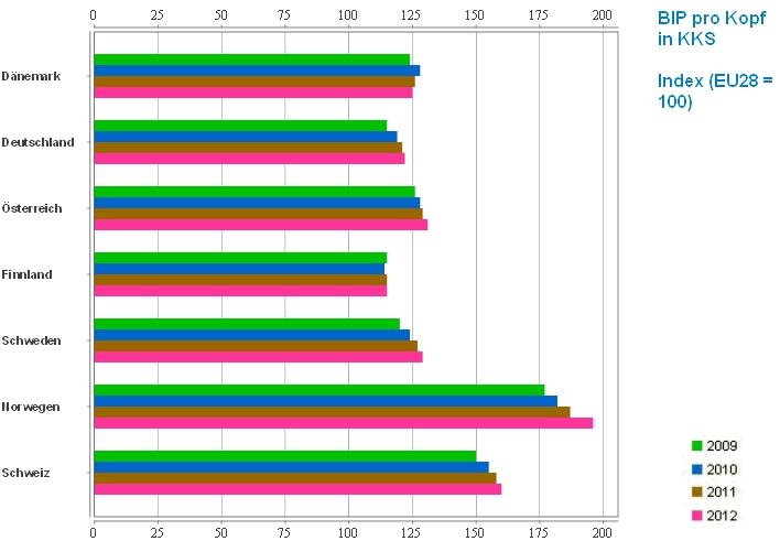 (Hinweis: Der Kaufkraftstandard (KKS; englisch Purchasing Power Standard, PPS) ist eine von der Landeswährung unabhängige fiktive Geldeinheit, die Verzerrungen aufgrund von Unterschieden im Preisniveau verschiedener Länder ausschaltet. Ein KKS entspricht dem EU-Durchschnitt für einen Euro. Es werden Kaufkraftparitäten (KKP) ermittelt, die aus einer Mischung repräsentativer Waren und Dienstleistungen eines Landes berechnet werden. Oft wird das Bruttoinlandsprodukt (BIP, angegeben in KKS) normiert, wobei 100 den EU-Durchschnitt darstellt. Ist der Wert größer als 100, so hat das Land (gemessen nach inländischer Kaufkraft) ein BIP pro Kopf über dem EU-Durchschnitt (und umgekehrt).)