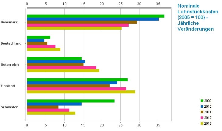 (Hinweis: Nominale Lohnstückkosten (NULC) sind definiert als Verhältnis von Arbeitnehmerentgelt (D1), in Millionen Einheiten Landeswährung zur Gesamtzahl der Arbeitnehmer, geteilt durch das Verhältnis des Bruttoinlandsprodukts zu Marktpreisen in Millionen, verkettete Volumen, Referenzjahr 2005 (CLV05) in Wechselkursen von 2005, zur Gesamtanzahl der erwerbstätigen Personen. Die Veränderung der nominalen Arbeitsstückkosten entspricht der Veränderung des Arbeitnehmerentgelts pro Arbeitnehmer, die über Änderungen der Arbeitsproduktivität plus Änderungen des Verhältnisses von Angestellten zu Erwerbstätigen hinausgeht.)