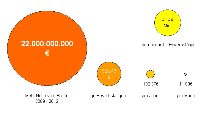 Nach einem Bericht des Wirtschaftsministeriums haben die Deutschen seit 2009 22 Milliarden mehr Netto vom Brutto erhalten. Soweit ist die Aussage also noch richtig. Doch bekanntlich machen solche Zahlen nur dann Sinn, wenn man sie genauer betrachtet:
