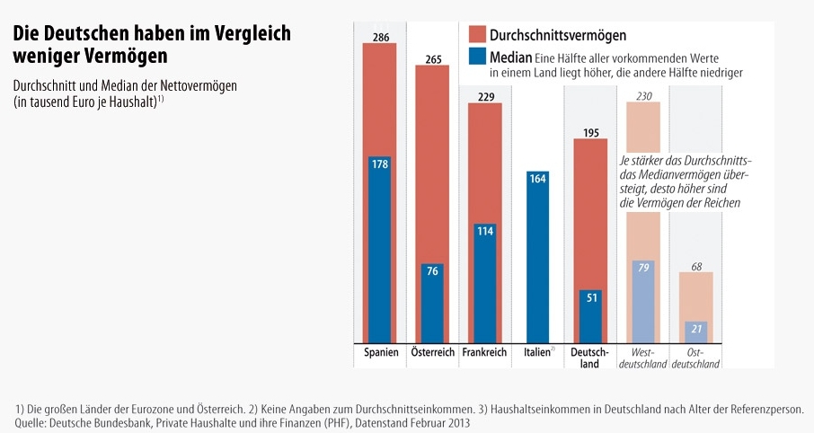 Deutschland ist bei weitem nicht in der Lage, die ihm von der FDP zugedachten Rolle der Dampflok für Europa zu spielen. Eine solche Denke ist hanebüchend und unrealistisch. Außer die FDP denkt dabei an die Vermögenswerte der Deutschen von ca. 12 Billionen Euro (Geld-, Sach-, Gebrauchsvermögen). Dann sieht es auf den ersten Blick wieder besser aus, aber auch nur auf den ersten Blick. Denn selbst Spanien, Frankreich und Italien besitzen im Durchschnitt und Median größere Nettovermögen als Deutschland: