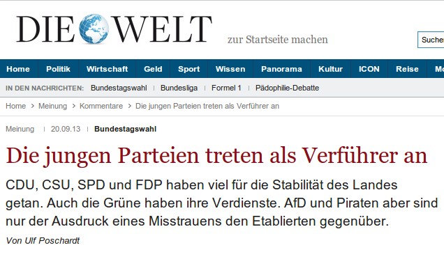 Aktuellen Umfragen zufolge soll die AfD selbst bei den „offiziellen Wahlumfragen“ die 5%-Hürde genommen haben. Angesichts der „Gefahr“ für die etablierte Parteien der Startschuss für die gleichgeschalteten Mainstreammedien das „pöse“ AfD-Gespenst aus dem Schrank zu holen, um das Wahlvolk auf Linie zu bringen. Eine kleine Auswahl allein der vergangenen 24 Stunden: