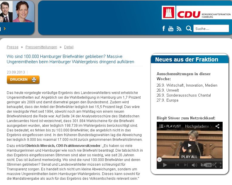 Die CDU Hamburg berichtet auf ihrer Website über 100.000 fehlende Briefwahlstimmen. Statt 301.884 Brief-Wahlscheine wurden nur 198.739 berücksichtigt.