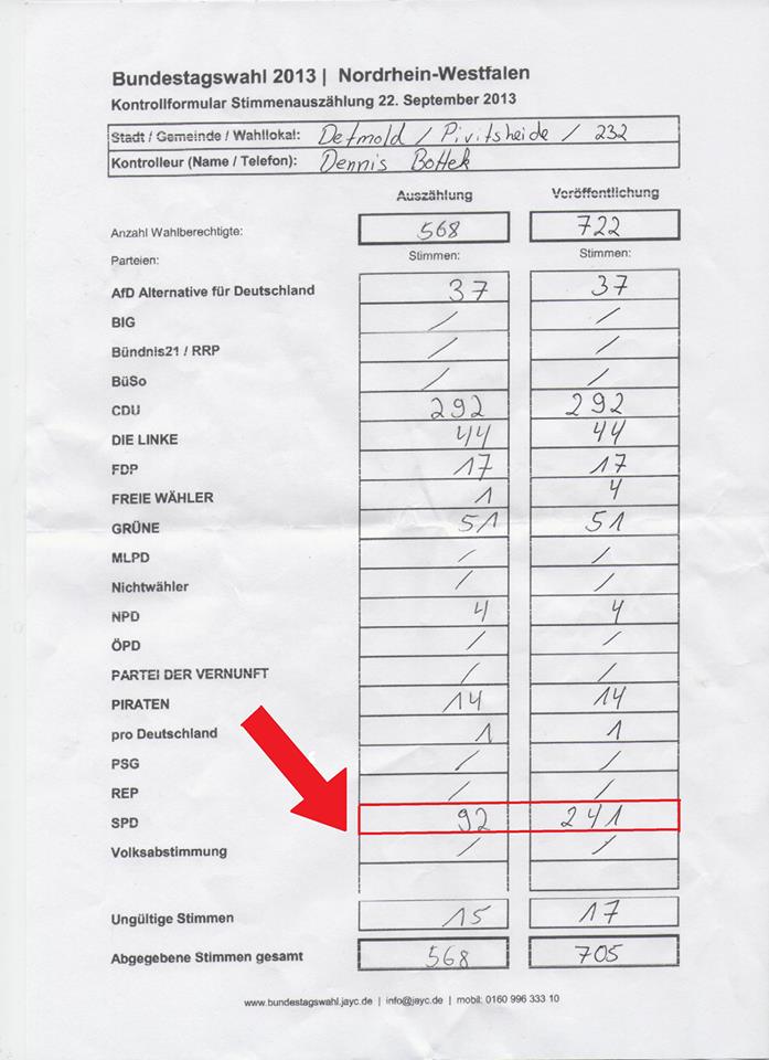 Anstatt 92 ausgezählten Stimmen für die SPD wurden 241 Stimmen veröffentlicht. Bekannt gemacht hat das ein Wahlbeobachter, der das nachstehende Kontrollformular via Facebook veröffentlicht hat.