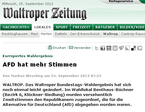 Versehentlich wurden Zweitstimmen für die AfD in einem Waltroper Wahllokal den Republikanern zugeordnet. Statt 71 Zweitstimmen erreichte die AfD nur 29. Auch hier wurde zwischenzeitlich der Fehler berichtigt.