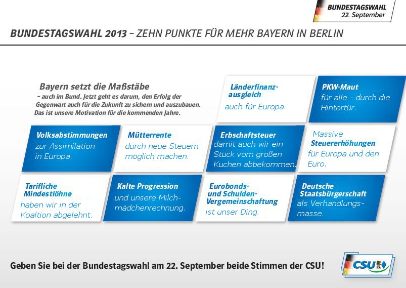 Gestern abend beim Entlereren des Briefkastens ist mir nachfolgender Wahlk(r)ampfflyer der CSU entgegen geflogen (hier nur der „redaktionell wichtige Teil“):
