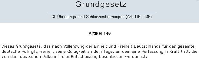 Heißt konkret, dass eine noch immer ausstehende Verfassungsgebung damit forsiert werden soll. Jedoch wird eine solche Verfassung ganz klar so gestaltet sein, dass Deutschland in Europa als europäisches Bundesland aufgehen wird. Dieses Ziel verfolgen unsere Politclowns mit der Abgabe von diversen Hoheitsrechten bereits seit Jahren. Was jedoch noch fehlt, ist die verfassungsgemäße Absegnung dieser Maßnahmen, da das Grundgesetz hier ganz klare Grenzen zieht. Deswegen brauchen die Politclowns eine neue Verfassung, die das Ganze legitimiert. Wobei diese neue Verfassung wiederum nur per Volksabstimmung durch das Volk abgesegnet werden kann.