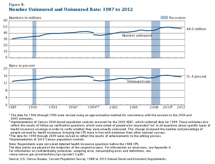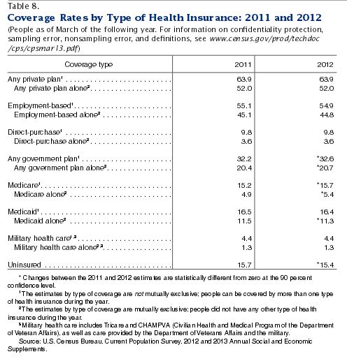 Trotz Obamacare (oder gerade deswegen?) hat sich 2012 die Anzahl an unversicherten US-Amerikanern nur leicht von 15,7% auf 15,4% (48 Millionen) reduziert.
