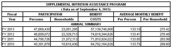 Im Juni 2013 haben 47,8 Millionen Menschen eine Unterstützung auf Lebensmittel erhalten. Seit 2010 hat sich damit deren Zahl um 7,5 Millionen (!) erhöht. Durchschnittlich waren 2013 47,7 Millionen US-Amerikaner auf diese Form der Sozialleistung angewiesen.
