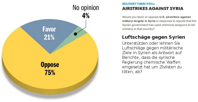 75% der Befragten lehnen Luftschläge gegen militärische Ziele in Syrien ab. Eine eindeutige Antwort, obwohl die Fragestellung impliziert, dass es Beweise für den Giftgaseinsatz durch die Assad-Regierung gibt, obwohl diese nach wie vor durch das US-Regime in Person von John Kerry nicht geliefert wurden.