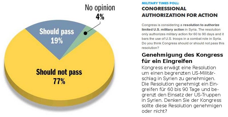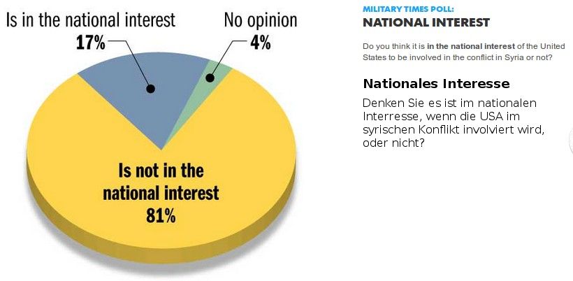 In einer Umfrage der Military Times haben sich der Großteil der befragten 750 US-Soldaten gegen einen Einsatz der USA in Syrien ausgesprochen und ihre Ablehnung auch verbal zum Ausdruck gebracht: