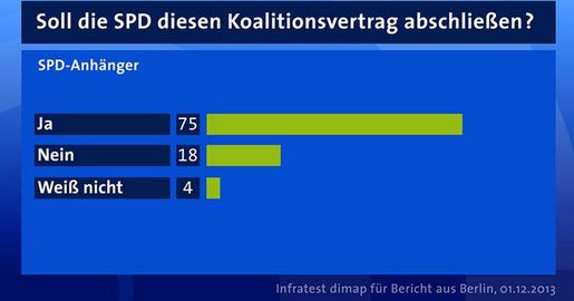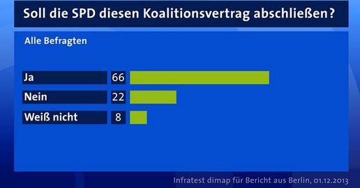 Eine Mehrheit der Deutschen will, dass die SPD-Basis dem von Union und Sozialdemokraten ausgehandelten Koalitionsvertrag zustimmt. In einer repräsentativen Umfrage von infratest dimap für den Bericht aus Berlin sprachen sich 66 Prozent der Befragten dafür aus, nur 22 Prozent sind der Meinung, die SPD sollte den Vertrag nicht unterschreiben.
