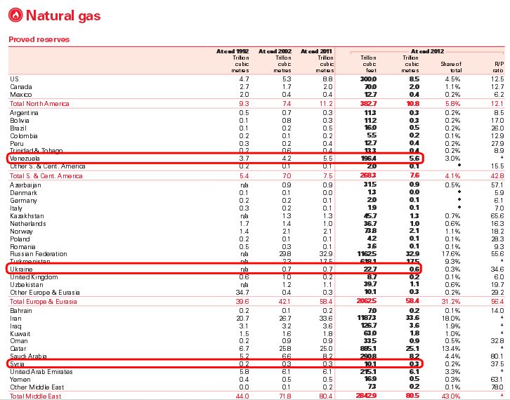 Und dann noch die Ukraine. Die Ukraine besitzt nach Angaben des BP Statistical Review of World Energy June 2013 zwar keine nennenswerten Erdölreserven und nur geringe Gasreserven in Höhe von 0,6 Milliarden Kubikmeter, aber hier sind noch nicht die vor Kurzem entdeckten Schiefergas-Vorkommen (vgl. hierzu Förderung durch Fracking) von 7 Milliarden Kubikmeter und die Schieferöl-Reserven von 1,2 Milliarden Barrel beinhaltet: