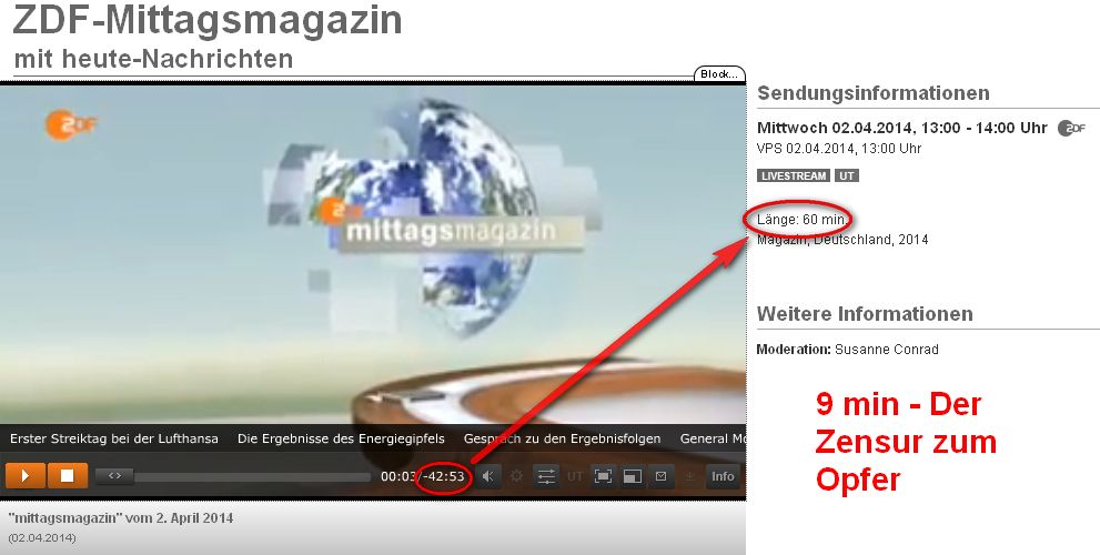 Doch dem ZDF reichte das offensichtliche Wegzensieren der kritischen Anmerkungen nicht und so hat das ZDF zwischenzeitlich das ganze Interview aus der in ihrer Mediathek verfügbaren Version des Mittagsmagazins von gestern herausgeschnitten: