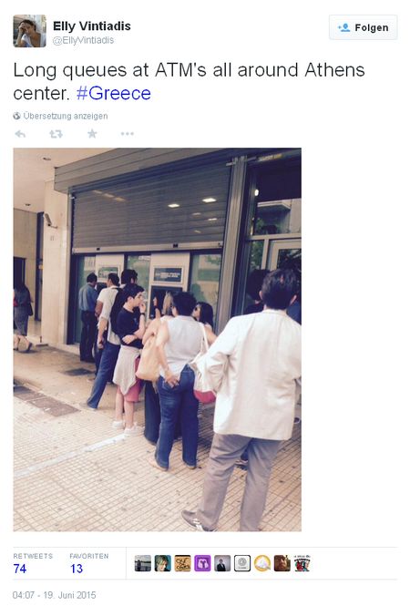 In den sozialen Medien tauschen die Menschen Fotos von langen Schlangen an griechischen Geldautomaten, wo normale Bürger ihr Geld von den in Schwierigkeiten geratenen Banken abheben wollen.