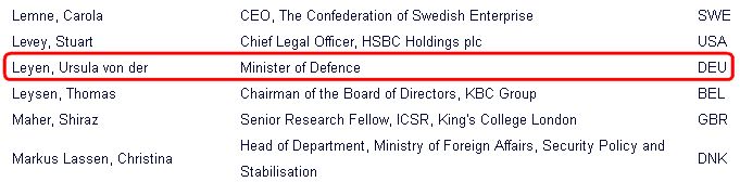 Beim Durchschauen der Teilnehmerliste ist mir vor allem ein Name ins Auge gesprungen. Der von Ursula von der Leyen. Deutsche Verteidigungsminsterin und Merkels (neben Thomas de Maziere) Frau für egal welches Politikressort auch immer.