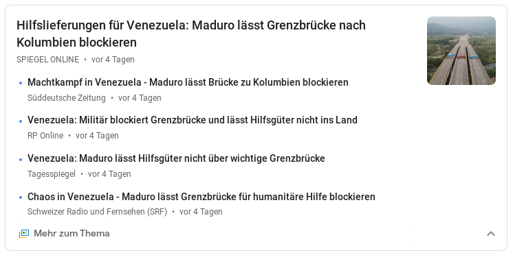 Bildquelle: Screenshot-Ausschnitt Google News "Venezuela Grenzbrücke" - Abruf am 11.2.2019 https://news.google.com/search?q=venezuela%20grenzbr%C3%BCcke&hl=de&gl=DE&ceid=DE%3AdeBildquelle: Screenshot-Ausschnitt Google News "Venezuela Grenzbrücke" - Abruf am 11.2.2019 https://news.google.com/search?q=venezuela%20grenzbr%C3%BCcke&hl=de&gl=DE&ceid=DE%3Ade