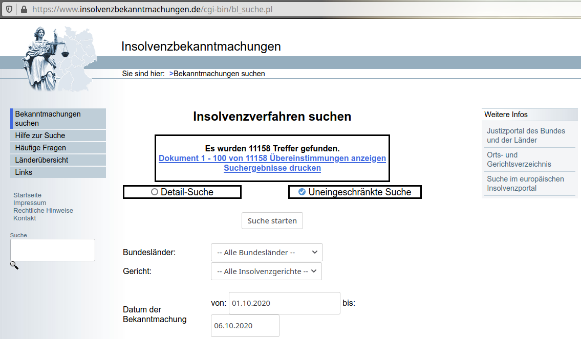 Unter dem Link https://www.insolvenzbekanntmachungen.de/cgi-bin/bl_suche.pl besteht die Möglichkeit die Insolvenzanträge taggenau einzusehen. Per heute 6. 7. Oktober sind in den letzten fünf sechs Tagen 11.158 582 Insolvenzanträge gestellt worden, wobei wir ein Wochenende dabei haben: