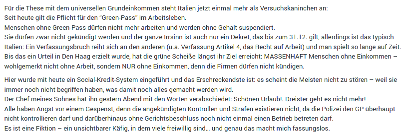 Um die Menschen von einem solchen Universellen Grundeinkomnen zu überzeugen, wäre doch eine Verknappung aller Güter, bei gleichzeitiger Preisexplosion der perfekte Schlüssel, dass die Masse nach einer staatlichen Unterstützung, dann in Form eines solchen Universellen Grundeinkommens, schreien. Wenn die Lebenshaltungskosten explodieren, gleichzeitig immer mehr Menschen in eine prekäre finanzielle Lage (aufgrund der Inflation oder auch Arbeitslosigkeit) kommen, wird dieses Universelle Grundeinkommen für viele zur „Lösung“ werden. Dass dieses Universelle Grundeinkommen kein Bedingungsloses Grundeinkommen sein wird, wie uns immer weisgemacht wird, versteht sich von selbst. Gentherapie, Kontrolle und Überwachung per diversen Mechanismen (Apps, QR-Codes) oder ein Wohlverhalten gegenüber staatlichen Maßnahmen sowie die Zustimmung zu „Umweltschutzmaßnahmen“ wie einem persönlichen CO2-Zertfifikat wird zur Bedingung gemacht werden, damit man ein solches Universelles Grundeinkommen erhält. Durch den Dreiklang aus Gentherapie, Überwachung und Universellem Grundeinkommen (was im Übrigen mit der Abschaffung des Bargeldes und der Einführung einer zentralen Kryptowährung [CBDCs] der Notenbanken einhergeht) wird dann ein großer Schritt auf dem von den Internationalisten/Globalisten/Eliten (IGE) gewünschten Weg der Transformation aka Technokratie aka Transhumanismus vollzogen. Alles das, wovor Kritiker seit Jahren warnen, vollzieht sich innerhalb weniger Monate vor unser aller Augen.