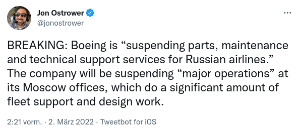 (EILT: Boeing stellt „Teile, Wartung und technische Unterstützung für russische Fluggesellschaften ein“. Das Unternehmen wird „wichtige Operationen“ in seinen Moskauer Büros einstellen, die einen großen Teil der Flottenunterstützung und Konstruktionsarbeit leisten.)
