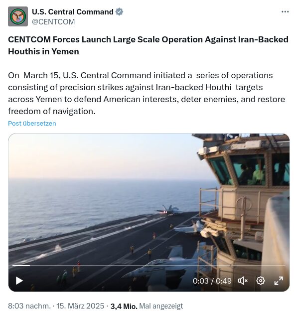 Dass in anderen Bereichen nach wie vor die gleichen Strategien gefahren werden und damit eben kein echter Systemwandel durch Trump und Co. stattfindet, zeigt nachfolgende Meldung eindrücklich. So hat Donald Trump dieser Tage eine Reihe neuer Luftangriffe auf die jemenitische Hauptstadt Sanaa angeordnet, die in der Hochleistungspresse fast komplett ausgeblendet wurden/werden. Trump warnte, er werde weiterhin „überwältigende tödliche Gewalt (overwhelming lethal force)“ einsetzen, bis die vom Iran unterstützten Houthis ihre Angriffe im Roten Meer vollständig einstellen.