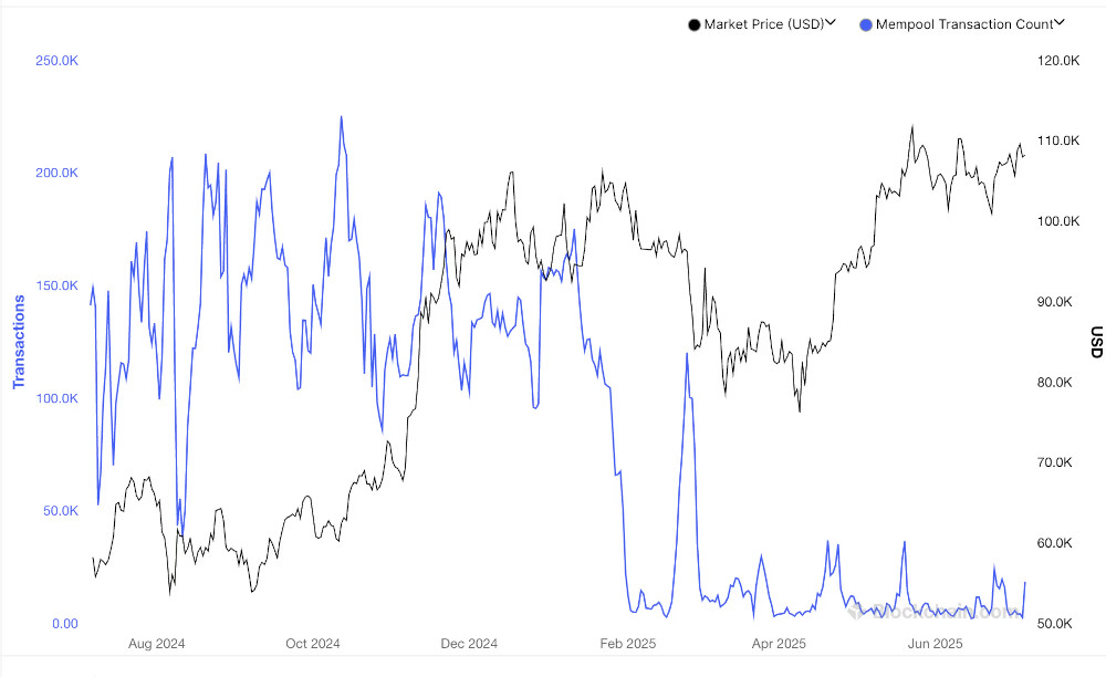 Der Bitcoin-Blockchain fehlt es derzeit an aussagekräftiger On-Chain-Aktivität, selbst wenn ihr nativer Token, der Bitcoin, nahe einem Rekordpreis pro Einheit gehandelt wird. Am Samstag gab es im Mempool gerade einmal 5.000 Transaktionen, die auf die Aufnahme in einen Block warteten. Später lag die Zahl bei 15.000, was laut der Datenquelle Blockchain.com immer noch weit von den 150.000 entfernt ist, die auf Verarbeitung warteten, als der BTC-Preis Ende 2024 erstmals über 100.000 US-Dollar stieg.
